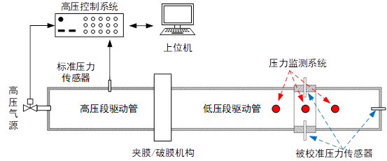 激波管动态校准系统由高压段驱动管、低压驱动管、夹膜/破膜机构、高压控制系统、压力监测系统、支撑架等组成。
